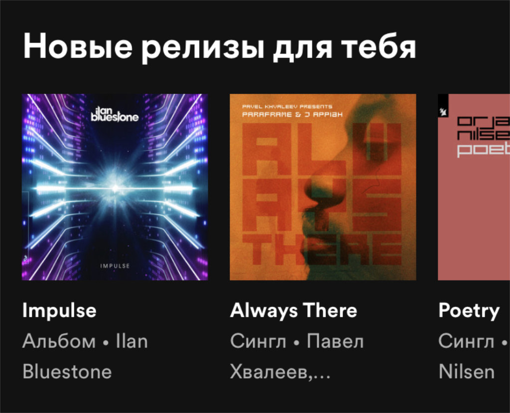 ◆ В Spotify удобно следить за релизами музыкантов. Spotify ловко подсовывает мне новинки любимых исполнителей, на которых подписан. Сервис либо показывает их уведомлениями, либо кидает в ленту.