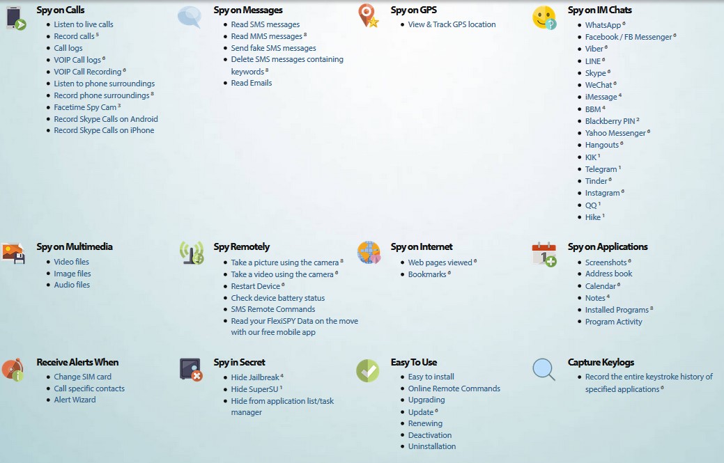 Большинство подобного рода ПО разрабатывается в Америке и к ним применяется ряд запретов, согласно местному законодательству. Однако эти нормы не распространяются на программу FlexiSpy. В ее наборе насчитывается более 150 опций для слежения, и регулярно добавляются новые функции.