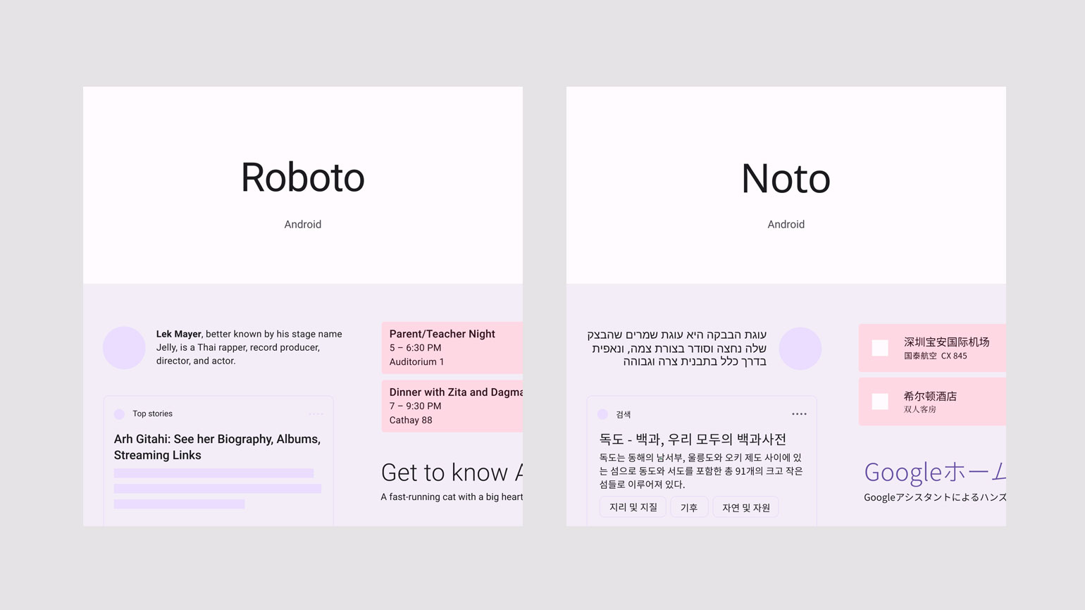 Системный шрифт в Android ― Roboto. Альтернативный ему шрифт ― Noto, он предназначен для тех языков в приложениях Chrome и Android, которые не поддерживают основной шрифт. Google не ограничивает разработчика в использовании шрифта, предлагая собственные рекомендации по выбору гарнитур для заголовков и подписей.
