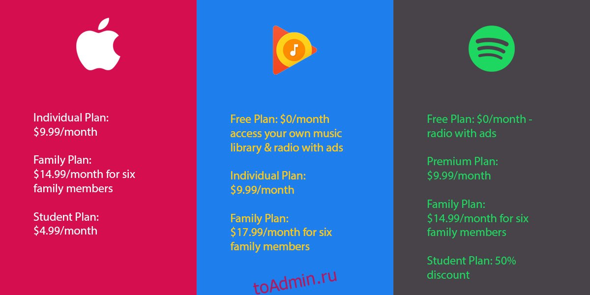 Если вы подписываетесь только на услугу одного человека, все три услуги имеют одинаковую запрашиваемую цену. Однако Apple Music дает вам первые три месяца бесплатно.