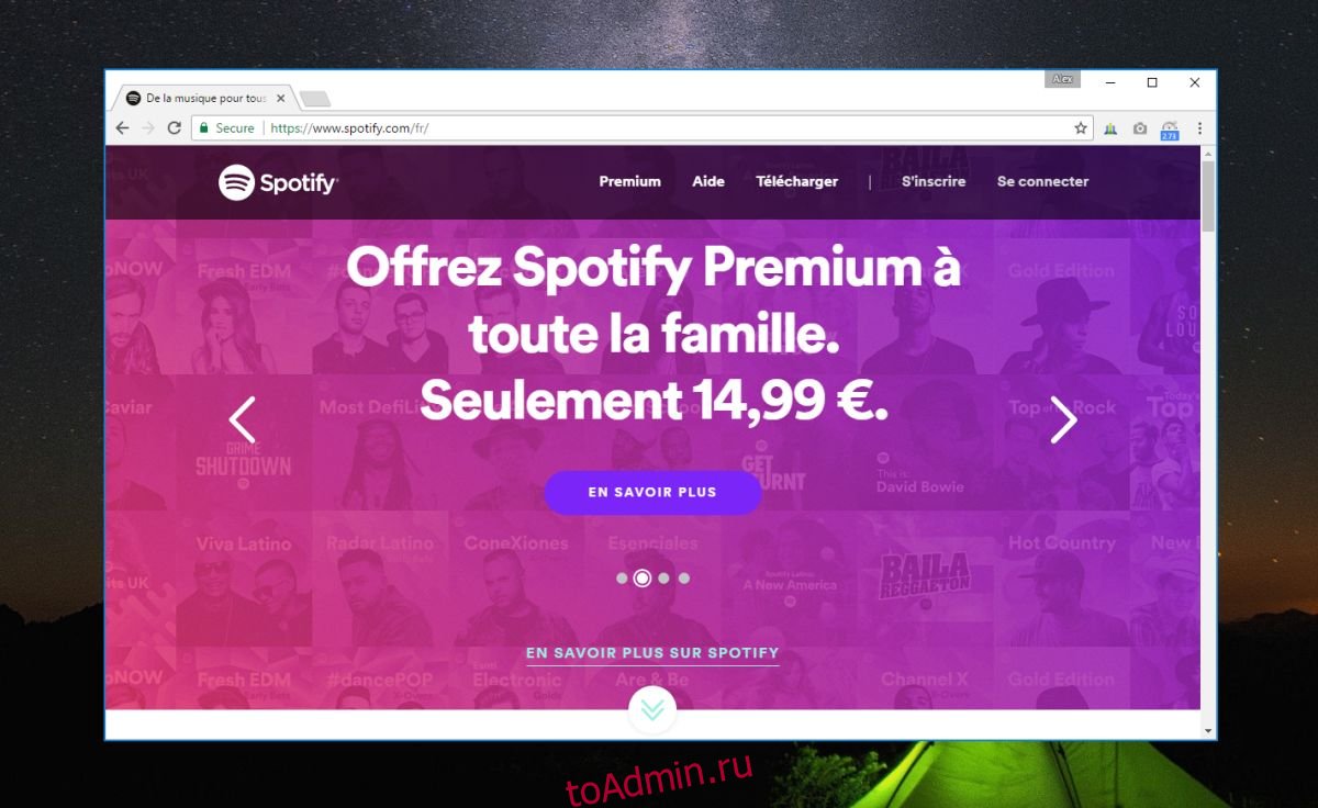 Как указывалось ранее, услуги потоковой передачи музыки ограничены регионом. Возможно, вы сможете позволить себе услугу потоковой передачи, и вам может понравиться выбор музыки, которую предлагает услуга, но вы не можете купить подписку, если услуга недоступна в вашей стране. Вы можете использовать VPN для доступа к службам, у которых есть бесплатная версия, которой в данном случае является Spotify.