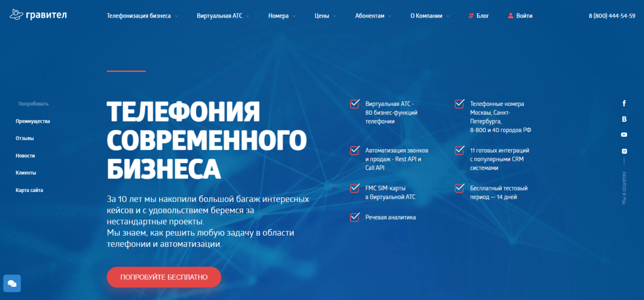 Gravitel — достойный оператор IP-телефонии, предлагающий качественные решения для офисов и компаний любого размера. Имеет расширенный список функций, которые пользователь подключает буквально в два клика в личном кабинете. Это группировка сотрудников по отделам, корпоративный чат, контроль и анализ звонков по различным параметрам. Стоимость самого дешевого тарифа виртуальной АТС на 5 пользователей начинается от 1780 рублей, а тариф на дополнительного пользователя составляет 600 рублей в месяц. Он существенно дороже по сравнению с другими провайдерами, но стоимость оправдывается функциональностью и постоянной хорошей связью. Так что из серьезных недостатков можно назвать только высокую цену услуг.