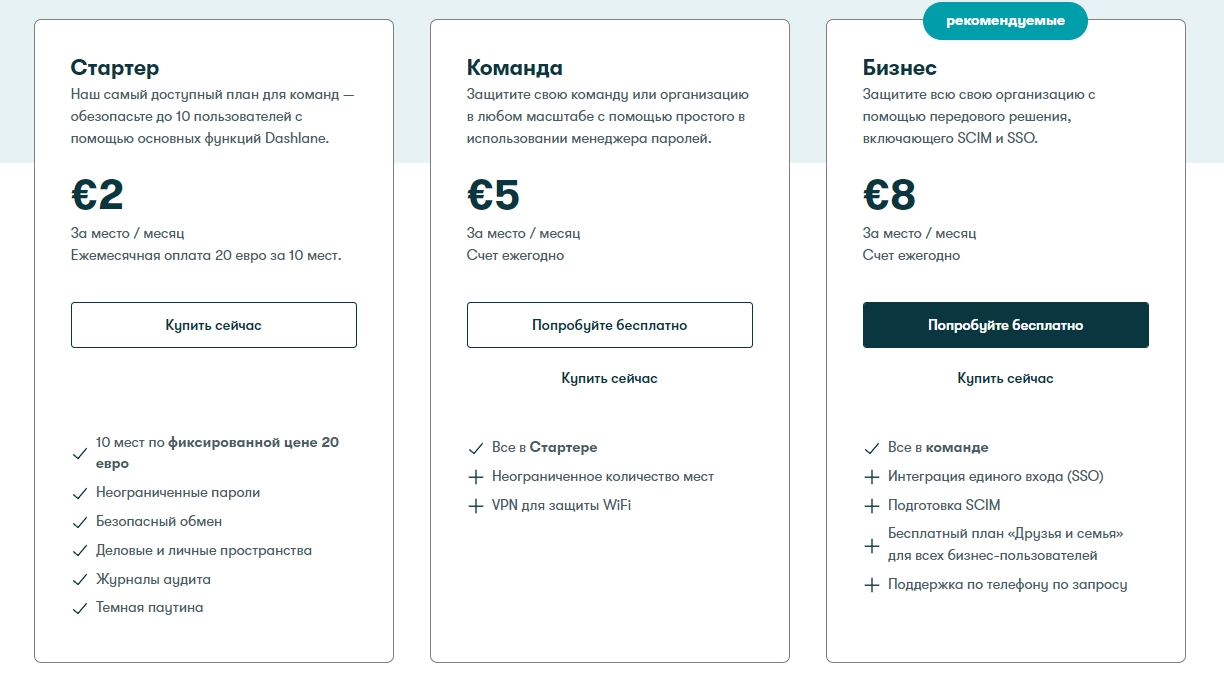 Неплохая бесплатная версия у Enpass, но можно хранить только до 20 паролей и нельзя пользоваться приложением. У Keeper есть тарифы для малых и крупных предприятий.