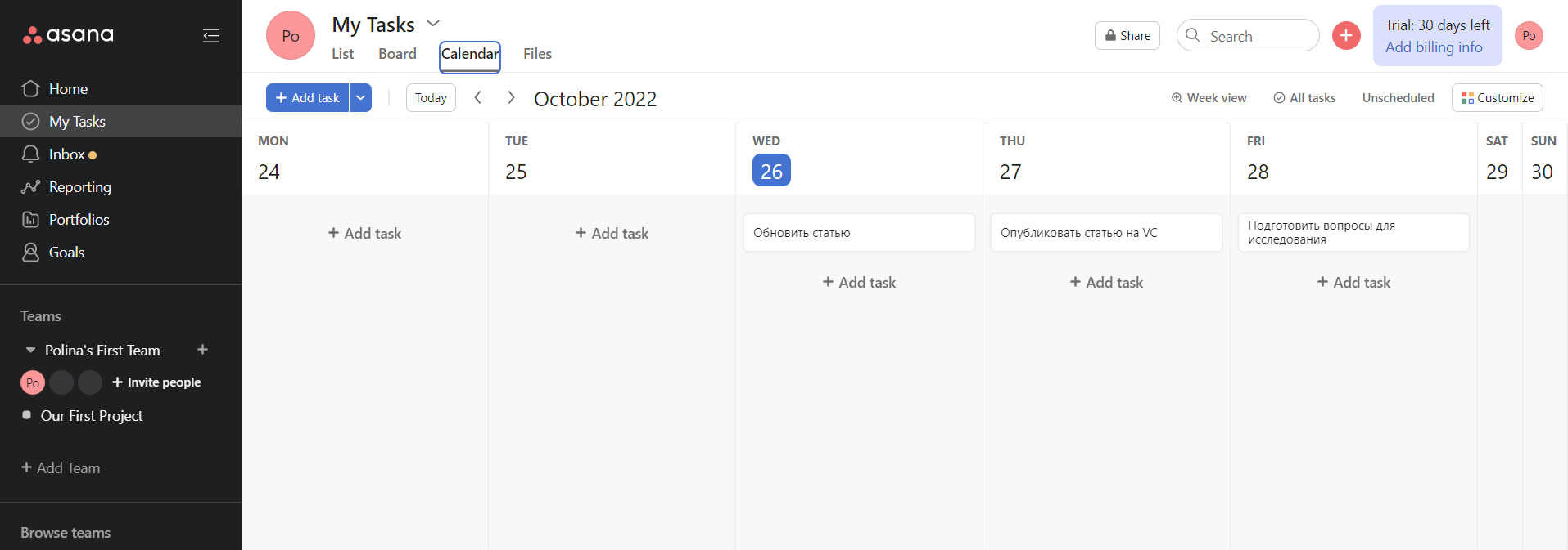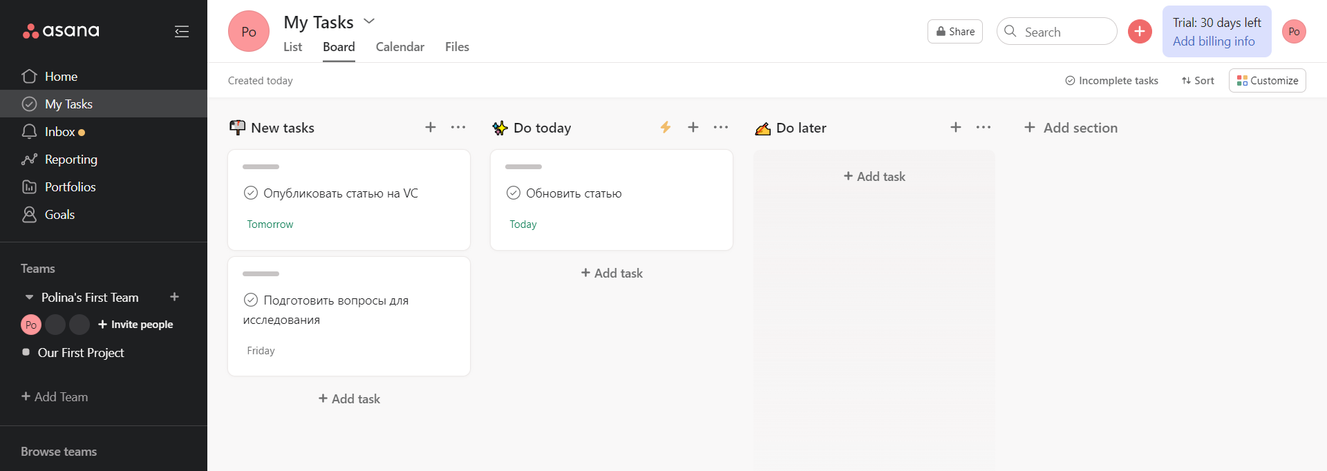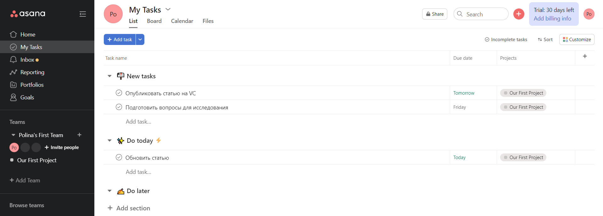 Основные функции — создание задач, назначение ответственных, расстановка приоритетов, отправка сообщений, приглашение членов команды в проект в Asana, интеграция с различными сервисами, такими как Gmail, Zoom, Slack и т. д. — доступны в бесплатном тарифе. Бесплатной версией можно пользоваться неограниченное время.