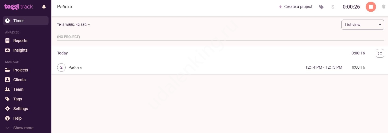 Эта программа тайм-трекер достаточно проста в использовании – русифицированного интерфейса нет, но достаточно знать английский на базовом уровне, чтобы все понимать. Работает на разных платформах (ПК, смартфон) и может использоваться как командами, так и в индивидуальном порядке. Пользуйтесь в автономном режиме, синхронизация автоматически произойдет при подключении к сети.