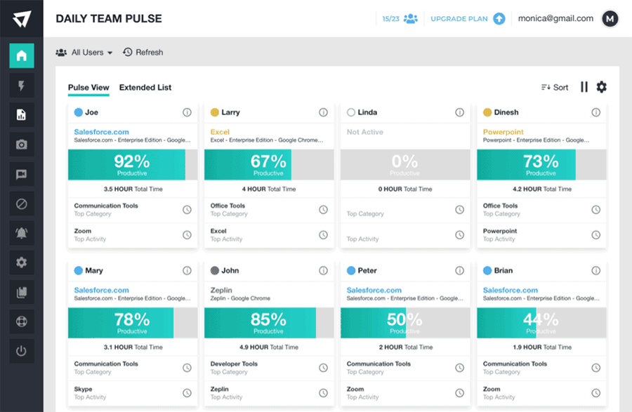 Основные назначения программы ActivTrak — это отслеживание действий пользователей на рабочих компьютерах, аналитика их продуктивности и своевременная блокировка возникающих угроз. Для этого, помимо стандартных средств мониторинга, данная система включает в себя кейлоггер и возможность блокировать доступ к запрещенным интернет-адресам. Программное обеспечение может быть установлено непосредственно на компьютере, или же аккумуляция данных может происходить на облачном сервисе. Возможности программного решения довольно широки и включают в себя видеозапись экранов сотрудников с возможностью экспорта снятого видео, а также автоматические уведомления о нарушениях при сохранении скриншота с заданным содержанием. Политика использования этой программы практически не накладывает ограничений на функционал бесплатной версии, но масштабирование на большее количество подконтрольных ПК или использование более значительного облачного пространства возможны только в PRO-варианте.